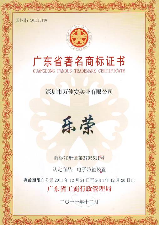 廣東省著名商標是國家建設國際知名品牌戰略的重要渠道,能夠有效保護著名商標所有人、使用人和消費者的合法權益,促進商品質量、服務質量和商標信譽的提高,通過對深圳市萬佳安實業有限公司的安防監控品牌“RELONG樂榮”進行審查和現場考察,以及嚴格的相關部門及行業協會評審,經過廣東省著名商標認定委員會討論、認定,“RELONG樂榮”品牌取得了專家的一致認可,榮獲“廣東省著名商標證書”。