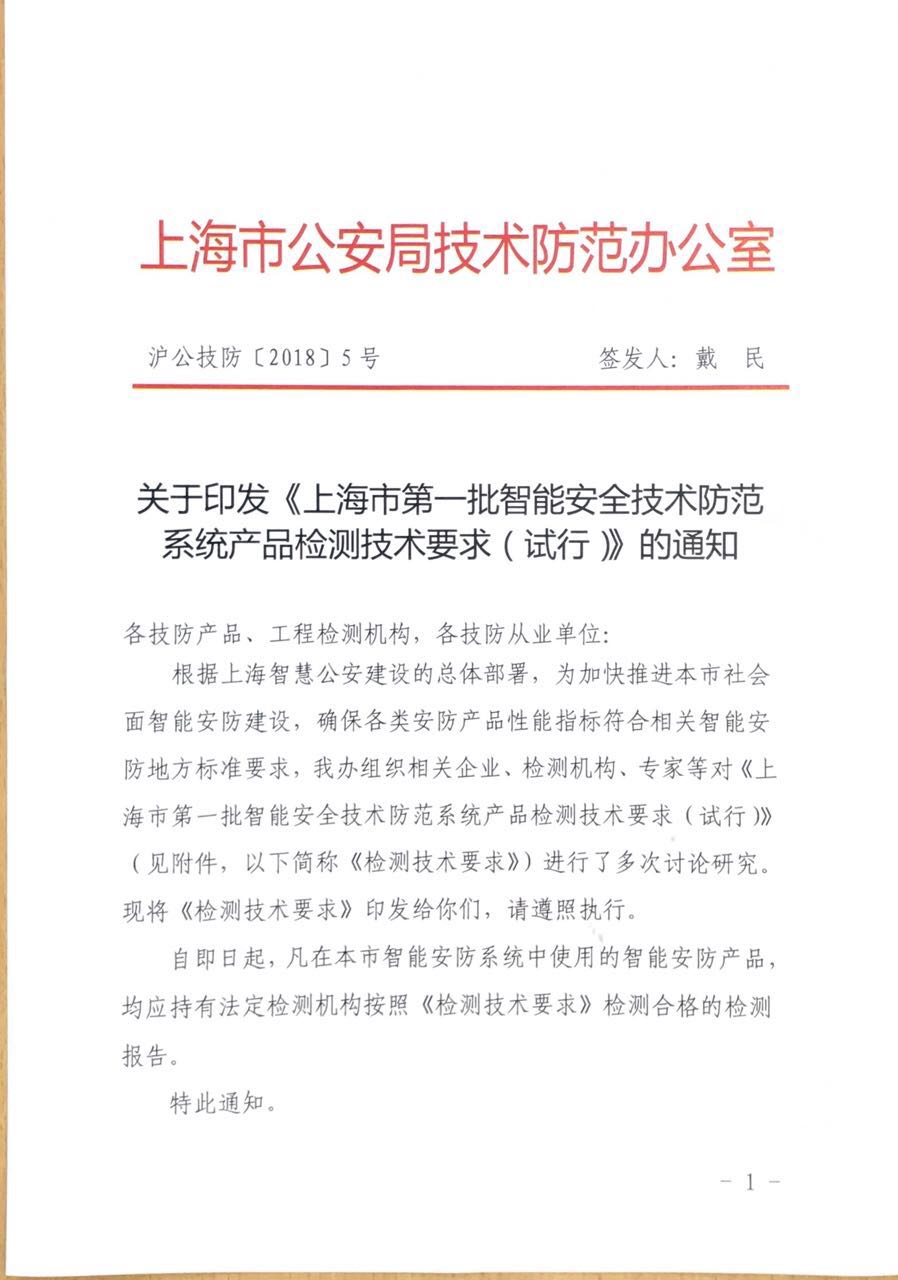 關于印發《上海市第一批智能安全技術防范系統產品檢測技術要求(試行)》的通知